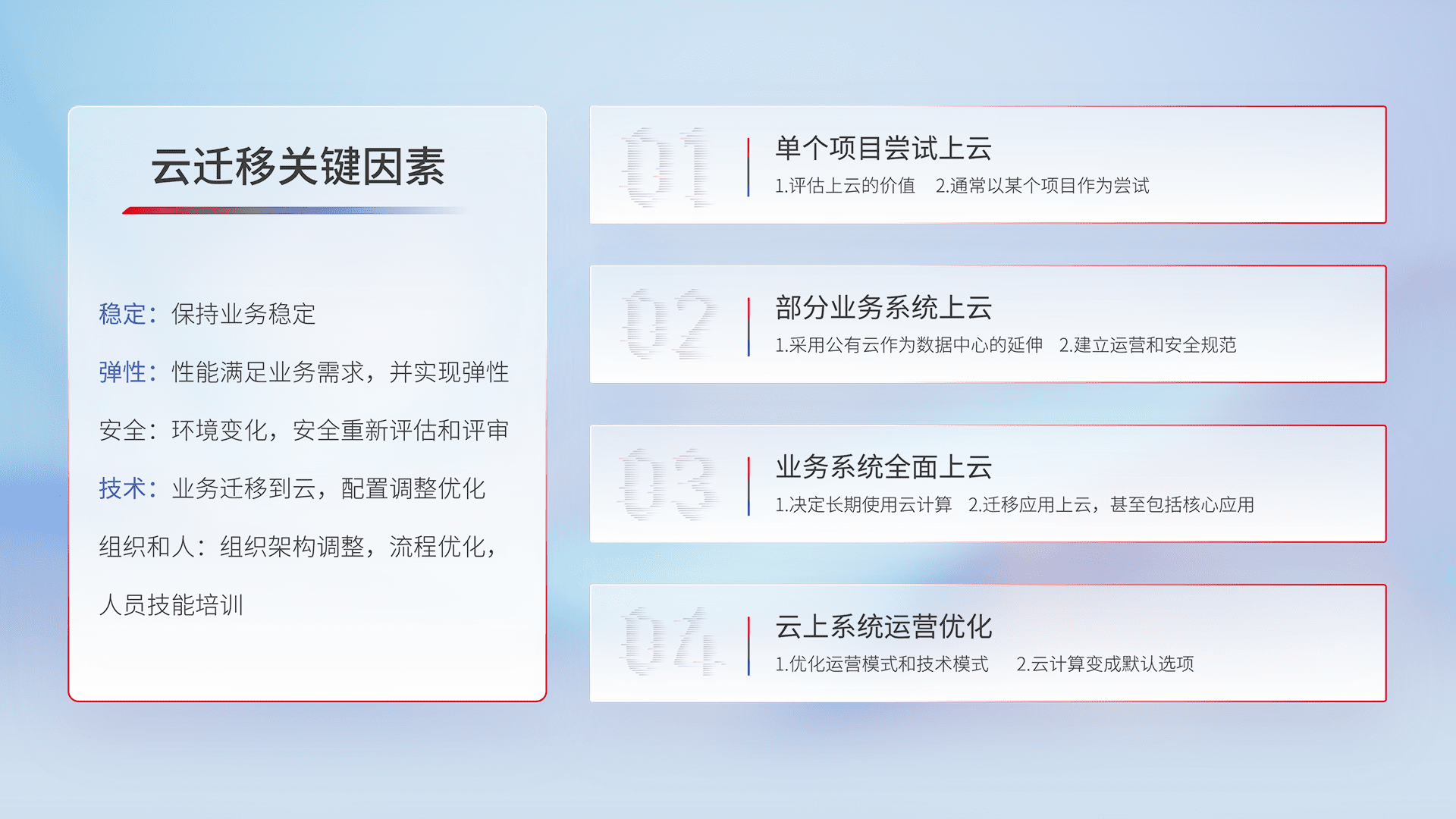 结合实际业务,,从规划设计、、云平台选型、、、云原生改造、、、、数据迁移、、集成交付,,,迁移全过程为客户识别最佳上云路径,,,,做好风险识别管理,,,,设计网络架构、、、身份权限、、、、安全审计合规、、、操作审计、、日志审计、、、监控告警策略、、多站点容灾设计等,,,,对云上基础设施进行整体规划,,提升IT治理水平,,,以满足弹性、、、、高可用、、高性能的需求。。。。